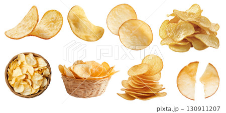 Potato chip chips, many angles and view side top front heap broken pile basket stack on transparent background cutout, PNG file. Mockup template for artwork