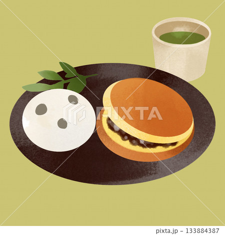 日式點心套裝插圖,包括豆沙大福、銅鑼燒和茶。可作為日式風格素材。