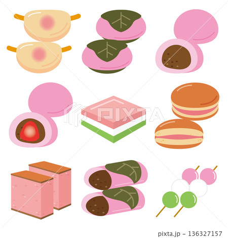 白玉、八橋、櫻花瓊脂、草莓大福等可愛又美味的傳統日本甜點的圖標集。