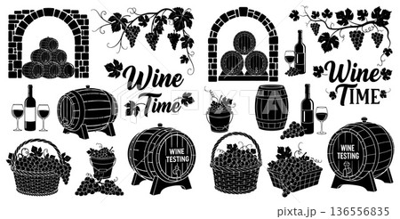 Wine and grape illustrations featuring barrels, bottles, and arches with premium labels