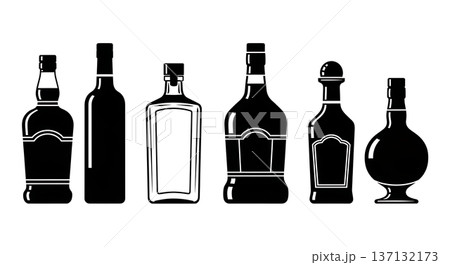 Black Solid Liquor Bottle Silhouettes Set of Six on White Background