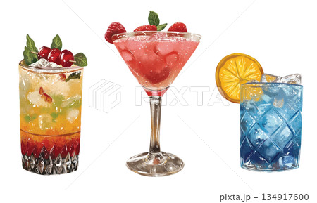 一套水彩插畫,包含三款雞尾酒,白色背景,適用於夏季度假村或酒吧的設計材料。