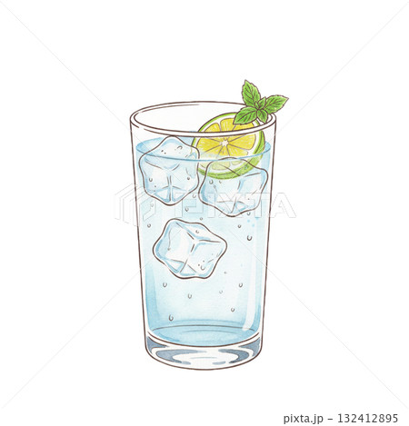 Refreshing lemonade with ice cubes and lemon slice illustration art