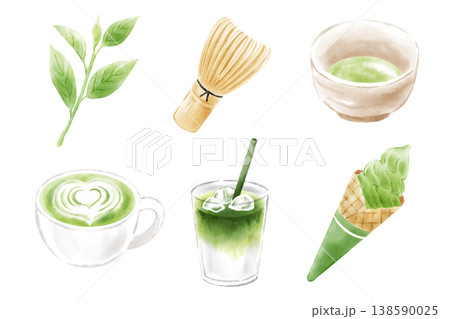 抹茶茶具,手繪水彩風格。