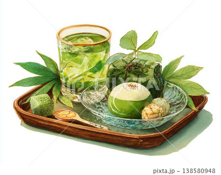 綠茶與日式點心,天然日式咖啡館,水彩插畫素材