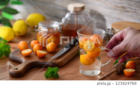 Cup of hot tea blended from rooibos, spearmint, apple, baobab on white wooden table.