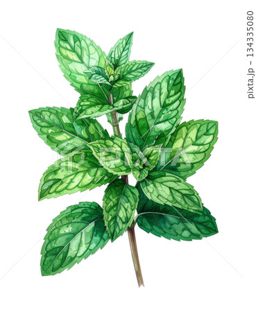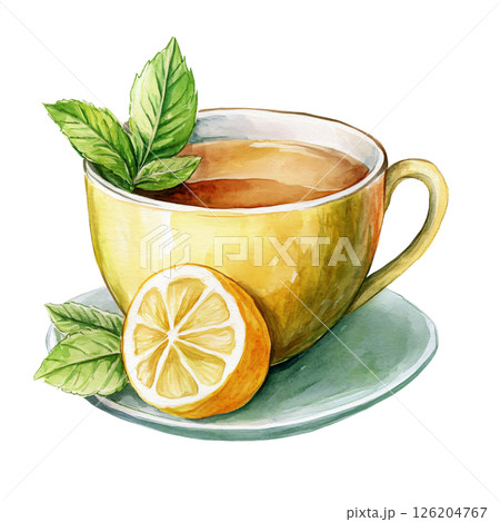 Watercolor illustration of cup of tea with fresh mint leaves, lemon half, and saucer, evoking refreshing and calming beverage experience