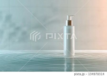 White pump skincare bottle on soft surface with water ripple texture. Minimalist mockup design with pastel tones and calm lighting