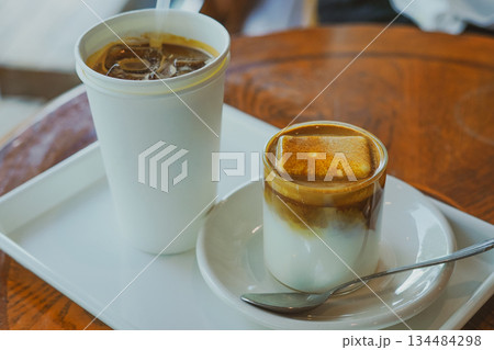 Ice Cream Latte and Paper Cup Iced Americano on a Cafe Tray by the Window