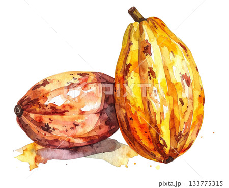 Assortment of cocoa beverages and raw cocoa pods in artistic illustration. Watercolor style