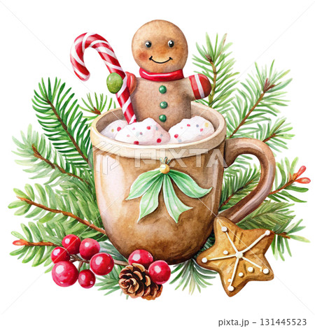 Watercolor Cute Hand Drawn Christmas Mug with cocoa and whipped cream Illustration with Festive Holiday Design for Cozy Art