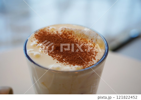 Cappuccino with cocoa powder in a glass on the table
