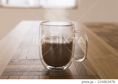 桌上的雙層玻璃杯裡盛著熱可可