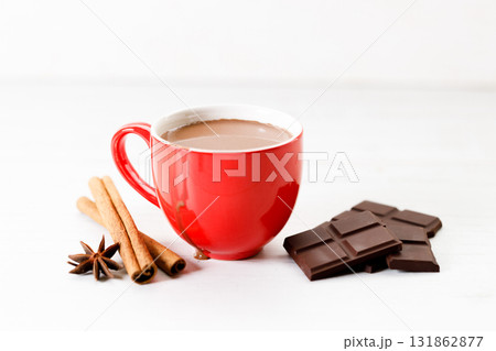 Hot chocolate in red cup on white wooden table background.