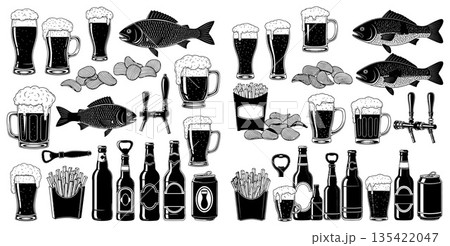 Assortment of Beer Glasses Bottles Fries Chips and Fish Illustrations