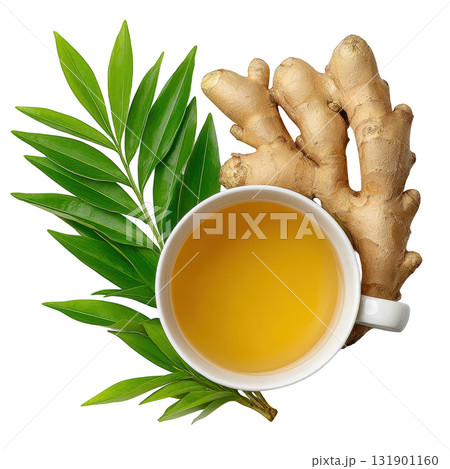 Fresh Ginger Tea with Green Leaves in a White Cup Perfect for Wellness and Comfort