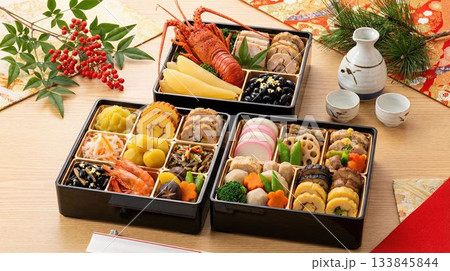 新年菜餚套裝的水彩插圖/雜煮、伊達捲、梅子、南天、黑豆、日本食材