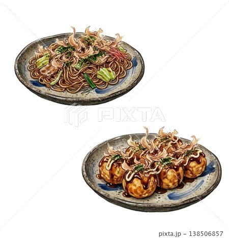 以日本繪畫風格繪製的炒麵和章魚燒插圖。