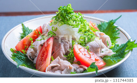 夏季豬肉涮鍋沙拉,由水菜、番茄和秋葵製成