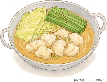 內臟火鍋(motsunabe)插圖,裡面有大量韭菜和內臟