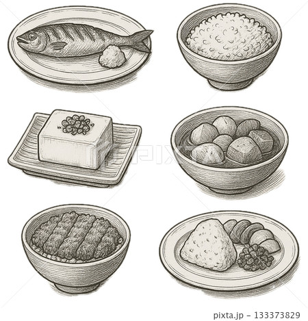 日式家常菜插畫集(米、烤魚、豆腐、飯糰、燉菜)