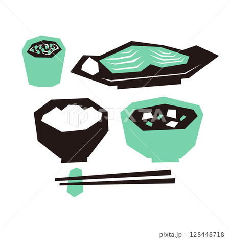 日本食物的平面插圖(米飯、味噌湯、鮭魚、納豆、筷子)