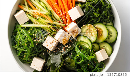 日式豆腐海藻沙拉,白色背景,俯視圖,擺盤,蔬菜,豆腐,裙帶菜,黃瓜,胡蘿蔔,健康,美食