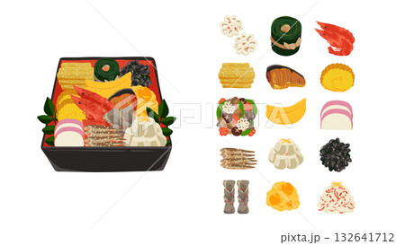 日本 Osechi 手繪向量插圖集(傳統日本新年菜餚、Jubako 盒)