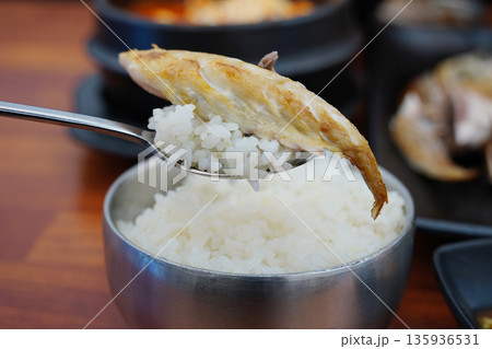 steamed white rice with a piece of grilled mackerel on top, a popular Korean home meal