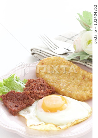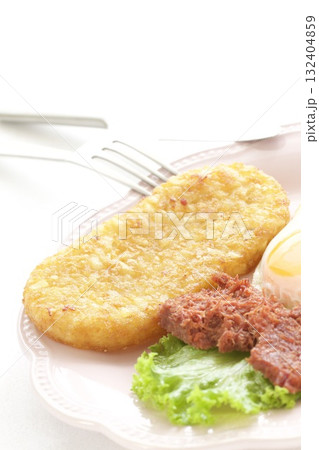 早餐盤,包括煎蛋、薯餅和鹹牛肉