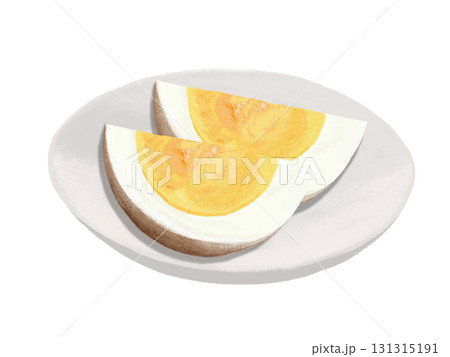 半熟的水煮蛋(調味蛋)切成兩半。手繪水彩畫,描繪蛋料理。