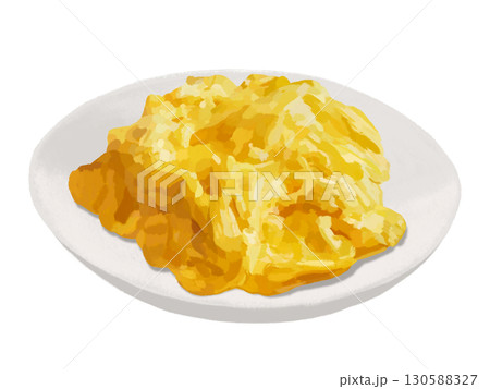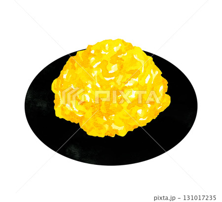 盤子裡盛著炒蛋。手繪水彩畫,描繪蛋料理。