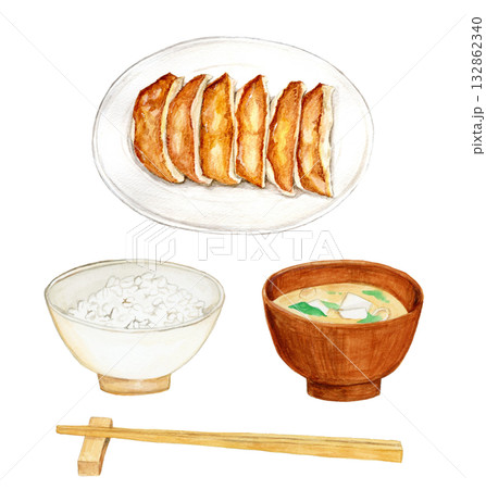 手繪水彩插圖,包括餃子、米飯和味噌湯