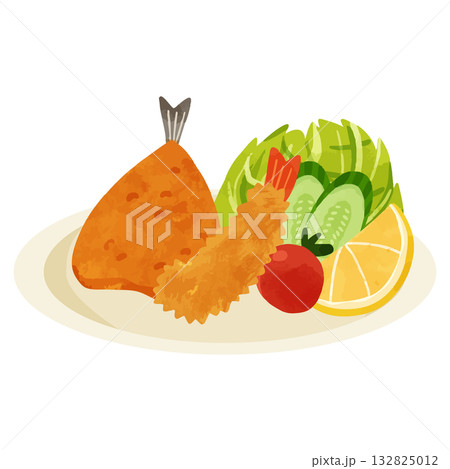 炸竹莢魚和炸蝦拼盤 - 水彩手繪向量插圖