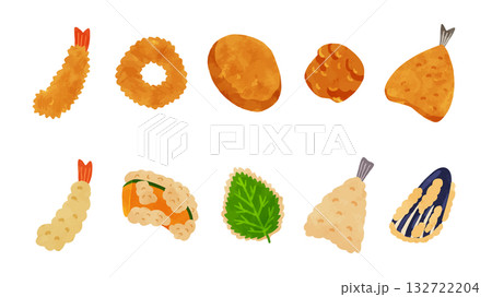天婦羅蝦、天婦羅南瓜、天婦羅紫蘇葉、天婦羅茄子、天婦羅茄子。水彩風格手繪向量插圖