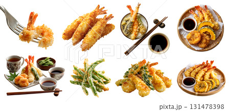 Set of Traditional Japanese deep-fried seafood vegetable tempura platter, many variety, transparent cutout PNG. Mockup template