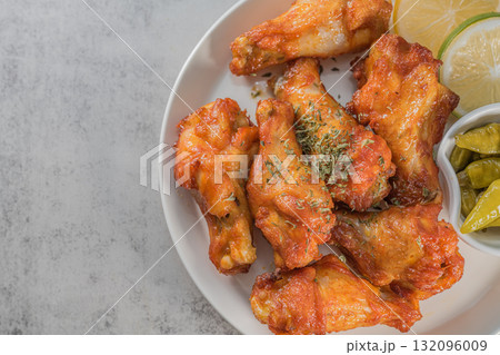Savor the irresistible allure of these delicious, spicy buffalo chicken wings. Crispy, cooked to perfection and coated in a flavorful sauce, they are sprinkled with sesame seeds