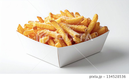 Freshly Cooked Crispy French Fries in a Red Container Isolated on White Background