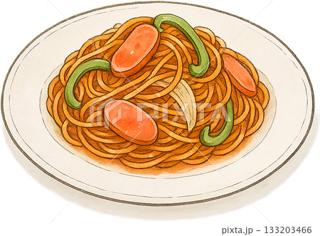 Delicious spaghetti with rich tomato sauce and basil garnish. Watercolor clipart