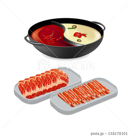 Chinese Hot Pot Set: Yin-Yang or Split Divided Pot with Two Broths (Spicy Red Chili and Creamy Herbal) and Platters of Raw Sliced Beef or Lamb, Vector Illustration on White Background
