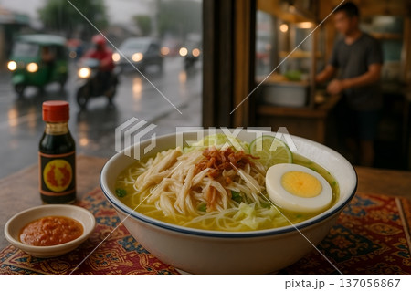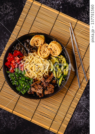 Delicious bowl of noodles with chicken and egg on vibrant tablecloth