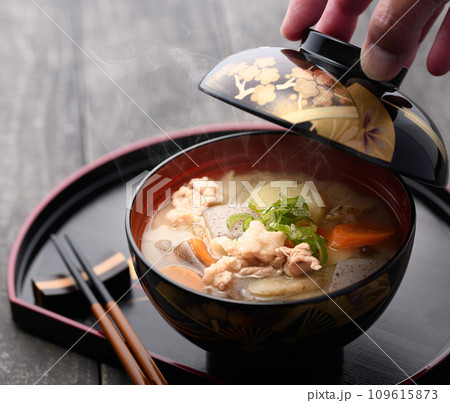 盛在湯杯裡的豬肉味噌湯,裡面有許多地瓜
