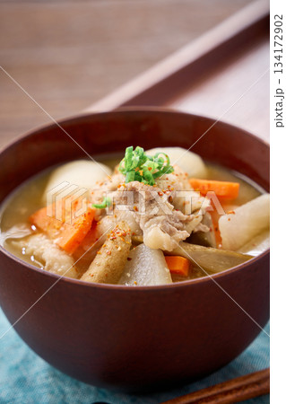 豚汁(味噌湯,裡面有很多豬肉和根莖類蔬菜)