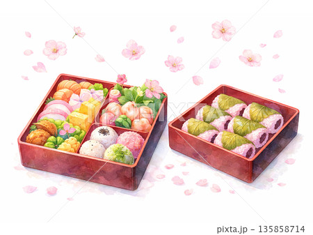 水彩插畫描繪了賞櫻、竹皮飯糰和櫻花、春遊、日本料理