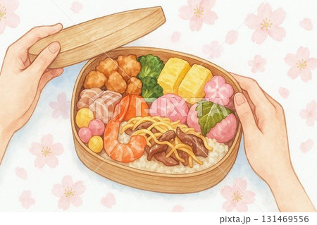 水彩畫的櫻花和美味的午餐盒觀賞櫻花的插圖[手繪]包括複製空間