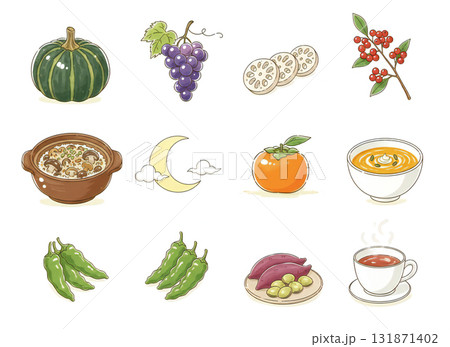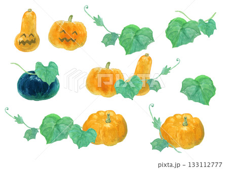 秋日滋味:南瓜、柿子、栗子和地瓜的水彩插畫。各式各樣的水果和各種組件的插圖。