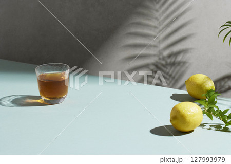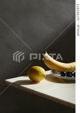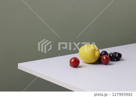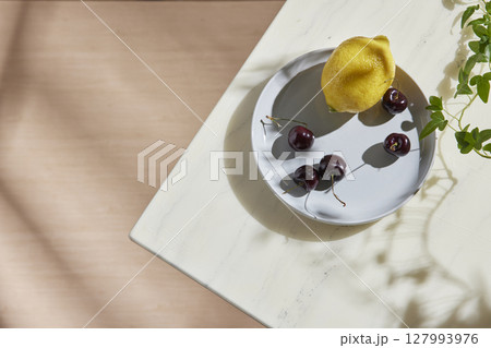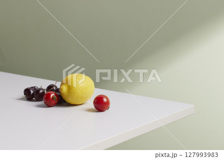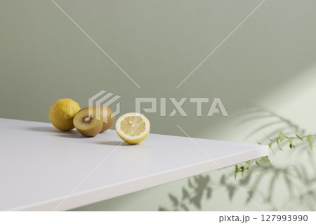 A cozy backdrop with fresh fruits and grass on a table with natural sunlight and shadows.