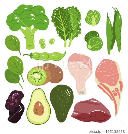 Vitamin k vector stock illustration. Food products with a high content of the vitamin k1 and k2. prunes, liver, pork chops, broccoli, green beans and peas, kale, spinach and brussels sprout.
