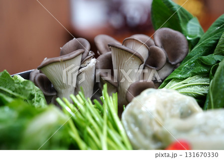 Fresh Oyster Mushrooms and Green Vegetables on Kitchen Table