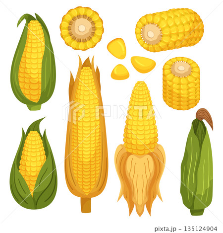 Set of Corn Cobs Are The Husked, Cylindrical, And Edible Part Of The Corn Plant. Corn Seeds, Or Kernels